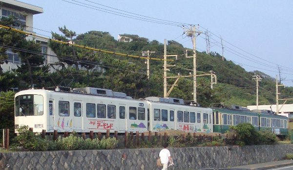 稲村ヶ崎−七里ヶ浜間をゆく1200形(左側2輌。右側2輌は20形)。2004年7月4日撮影であるが、この年は明治の広告塗装となっている。両サイドとも、江ノ島と海の風景と「カールおじさん」などがいっしょに描かれている。