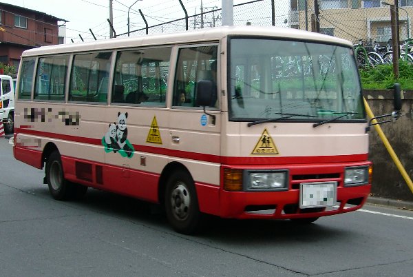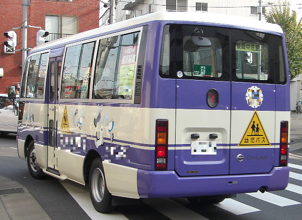 後ろはどうでしょうか?。すぎたまの住んでいる近くでは、駅向こうの幼稚園から、送迎バスがやって来ます。これも日産シビリアン。