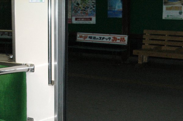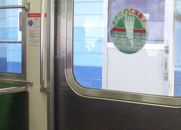 この画像は、303−353編成の、303号車後ろよりドアです。外の看板は、由比ヶ浜駅のホームと反対側にある看板です。この看板については、あとで記述します。作品に登場する看板や、後ろの塀の様子などからすれば、この位置が一応理屈に合った位置となるのですが、コメットさん☆が作品中でいる場所は、もう一つ前のドアのようです。しかし、そうだとすると300形全般に言えることですが、前よりドアの左側には座席がありませんので、このあたりはデフォルメがなされていることになります。2005年2月24日撮影。由比ヶ浜駅。撮影協力:Naka氏。