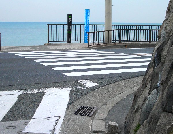 メテオさんが、作品中で立ちつくしているのは、この画像の中央付近です。ただ作品では、向こう側に見えるフェンスが、もう少し左寄りに描かれており、横断歩道を渡ってそのまま海に降りるようにはなっていません。また看板や標柱の類は、省略されています。2005年2月24日撮影。