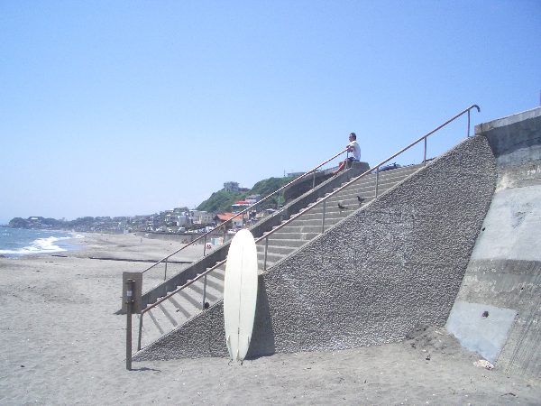 作品中では、もっと遠くから、かつもう少し左寄りから描かれるのですが、人が多く、あまり下がっての撮影はできませんでした。この画像で見る階段の下ぎりぎりのところに王子が、その左の砂浜部分にコメットさん☆が描かれますが、コメットさん☆は海に向かって歩き出します。