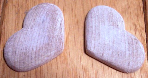 まずは使うパーツです。左からぶら下がる部分になるハート形の木製パーツ(朴の木?)、ロジュームメッキ加工なるものが施されたイヤリング金具、ビーズのコーナーで見つけたチェーン様(よう)のパーツです。中央下は、木製パーツを1個取り出してみたところです。