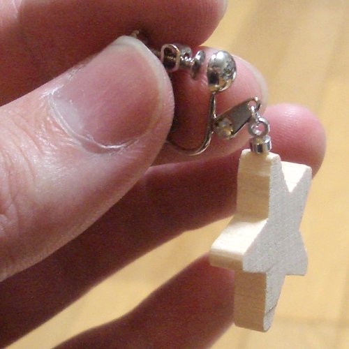 これはなかなか再現が難しいような気がします。耳たぶより前方に、星形の飾りを浮かせておかなければならない(そうでないと揺れない)からです。