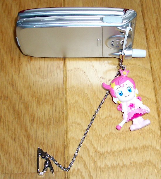 今度はひもの輪に余裕があったので、ちゃんとコメットさん☆を通して付けることが出来ました。携帯電話に付けてみたところの画像です。左下に伸びているのがクリップ金具です。この先の部分で、どこかにひっかけておくことが出来ます。例えばシャツの胸ポケットなどに付けておけば、下を向いても、携帯が落下しないようにできたりします。
