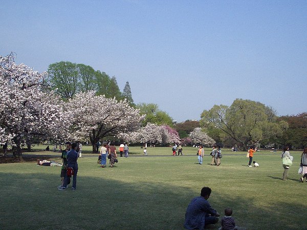 芝生の広場と、八重桜。新緑もきれいです。2004年4月12日撮影。家族連れにも最適。