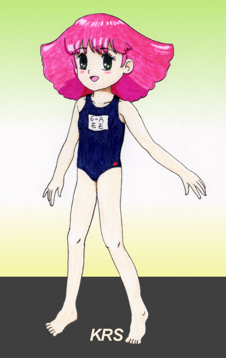 スクール水着ですので、色は紺と黒しかありませんが(他のデザインでは、緑やオレンジ、赤などいろいろあるようではあります)、ここでは黒で描いてみました。ミンキーモモさんには、黒が似合うようにも思います。