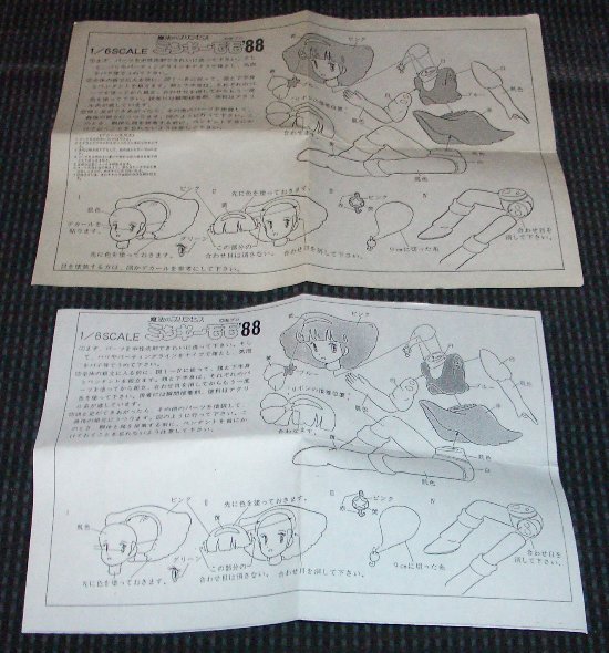初期版(上)と、再販版(下)の説明書の違い。紙のサイズと、デカールに関する記述の削除が目立つ。ポーズとしては難しいような気もするが、モモはどうしても頭が重くなるので、安定させるためにこのポーズになったとか言われている。