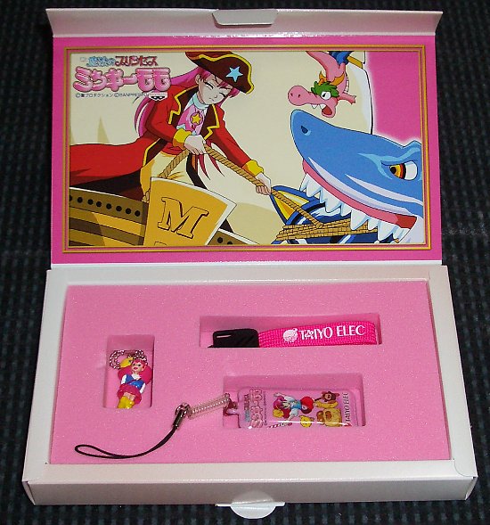 中身を開封してみよう。このようにウレタンスポンジで仕切られた中に、携帯につけるパーツがおさめられている。上はストラップ、下が液晶画面クリーナー、左がマスコットの小さい人形である。箱の裏側にも絵柄が入っているのが楽しい。