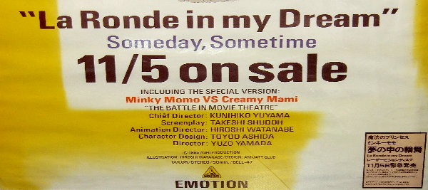 エモーションブランドで発売された「夢の中の輪舞」レーザーディスクの宣伝用ポスターである。当時モモが「何も着ていない」という絵柄に、衝撃が広がった。同人誌界でも賛否両論があり、一部で真剣な議論がかわされたようだ。当時既に有名なアニメーターであったわたなべひろし氏の原画によるもので、氏のイラストはこの頃から次第に画風が変化していく。パズル、LD−BOXにあるイラスト集などがその流れと言える。
