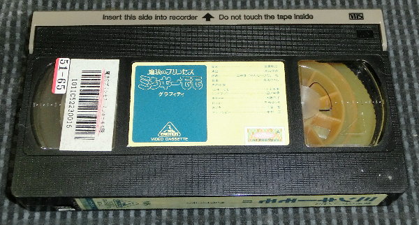 テープ本体。今やビデオテープというメディアそのものが、過去の物になりつつあると言えよう。右側リールの黄ばみが、時代を物語る。当時のビデオソフトは、上部のカバー部の色が薄い色か白になっているのが普通で、中には「copyrighted
