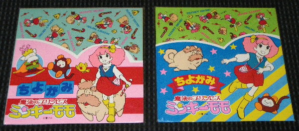 中身。4柄4色である。いろいろな姿のモモがちりばめられているが、柄の形は4色とも同じ。モモとシンドブックたち、文字などの刷版は同じものになっているのだと考えられる。