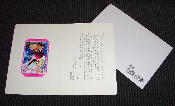 テレカの部分のみを拡大。特に一般的に出回っている「番宣テレカ」と変わりはなく、逆に巷に出回っている「番宣テレカ」は、この挨拶状から取り外されたものであると考えられる。紙の四隅に切り込みを入れ、そこにはめ込まれている。