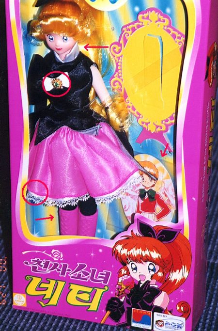 おもしろいことに、外の右下の絵は同じである。しかし人形の出来は…、一目瞭然である。ただまあそれでもロングヘアにしてあるなど、それなりに似せようとした努力のあとはうかがえる商品であろう。