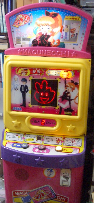 勝ちが一度でもあると、「私からのプレゼント受け取ってね」という音声とともに、下部のカード出口が電照される。ここにランプが灯るのはこの時だけで、カードが排出されるときには灯らない。また現在の常識からすると、ここもLED化して省電力化、ランプ切れ防止による省力化するところだろうが、1996年当時は適当な高輝度LEDが、安価でなかったのか中央パネル以外には、LEDは採用されていない。このあたりに今となっては古さを感じさせる。
