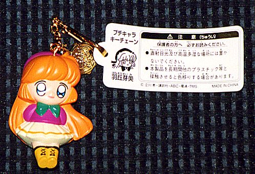 高さ5センチくらいのプラスチック製キーチェーン。全5種のうち、羽丘芽美のもの。頭部の金具の付け根はやや弱いので、破損に注意が必要。プチキャラキーチェーンには共通だが、キーリング金具のところにセイントテールの胸元のペンダントと同じ意匠の浮き出しパーツが付いている。
