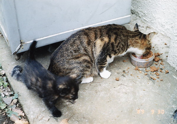 メト(右)とその子の「サビ」(左)です。当時は知識も無かったので、猫缶詰もあげっぱなし。掃除を軽くする程度。私の研究室の教授には、大変嫌われましたが、農業経済の研究室が協力的で、メトはそこで子猫を産みました。