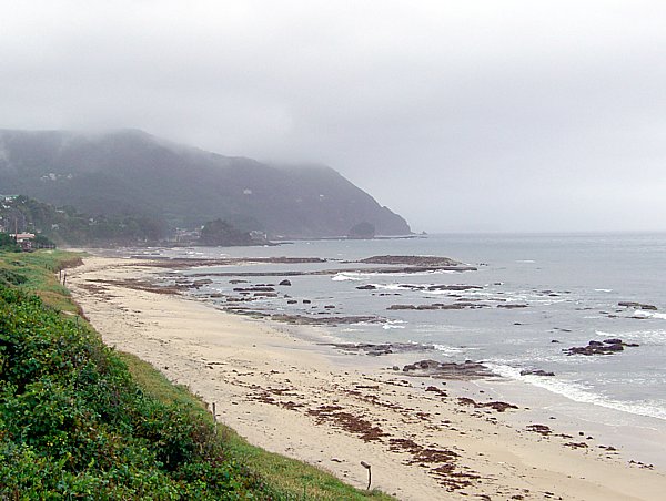 反対側を見たところ。意外と浜は岩がごろごろしており、泳ぐには注意が必要かもしれません。しかし、砂は白浜海岸に近いこともあり、白っぽいです。この日はあまり天気が良くなかったので、遠くの山がかすんでいます。