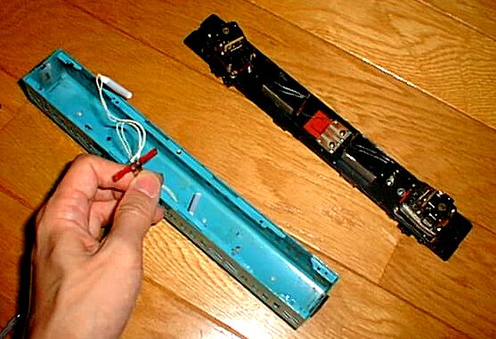 まずは現車を解体してゆく。この種車はどういうわけか、本来ないはずのモーター2個を搭載しているので、編成上はモーターは前後とも中央の車輌にあった方が都合がいいから、そのまま利用することとする。画像上は解体したままの車体。中央は動力装置(左右に見えるのが縦型モーター、エンドウV−19)。下は床板の止めねじ類である。