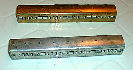 塗装はがしが完了した車体。上側がモハ102、下はクハ103−500予定車。