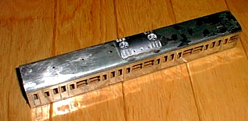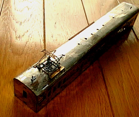 パンタとクーラーがついた場合のバランスなどを検討するため、下回りをはめて見る。信号炎管と車内灯支えも、既にハンダ付けされている。