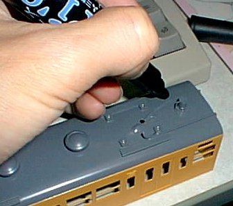 パンタの位置を正確にするには、ガイシ台を14ミリ×16ミリの間隔でつける必要がある。いろいろ考えたあげく、ガイシ台そのものをはんこのようにして、屋根上に押しつけ、位置を採ることにした。スタンプ台を使って印を付けるところ。