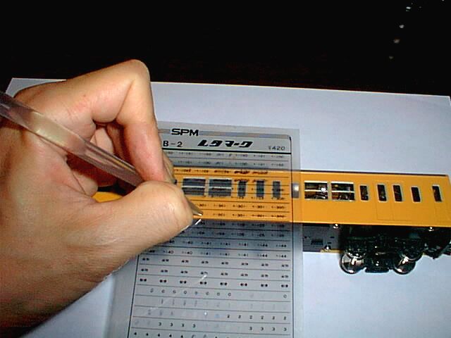 いよいよ最終段階。インスタントレタリングシートを使って、車輌番号の転写。この車は資料により、クハ103−576となる。