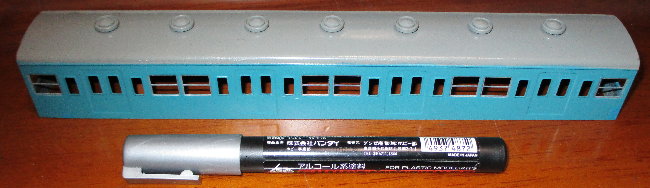 窓サッシ部分は、プレスで一段引っ込んでいる形状です。かつては烏口で銀色塗料を差したりもしましたが、表面張力の関係ではみ出しがどうしても出てきますので、今回は「ガンダムマーカー」を使いました。多少のりにくい部分もありましたが、まあまあうまくいった方だと思われます。