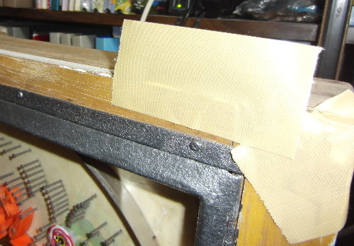 右上部分の木枠は、ハガレが進行しそうだったので、木工用接着剤で止めました。接着剤を塗って、張り合わせているところ。