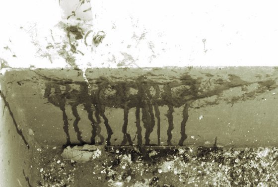 溝部分を拡大した画像です。矢印の先、黒く見える部分が溝ですが、ここに溜まる水の排水が考えられていません。上の画像にある、新しい棟での「謎のネジ止めアルミ板」は、この溝を「無かったことにする」ものであるのがわかるかと思います。