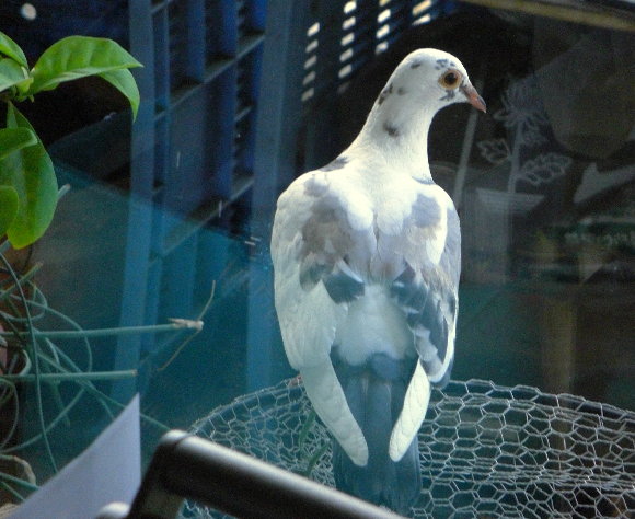 網戸の向こう側、プランターの中に入って、土をついばむ白ちゃん。ここはハナニラが植わっていた場所ですが、鳩たちはどうもお気に入り?。6月7日。
