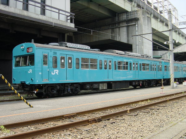 クモハ103−120の側面。AU−712クーラーで冷房改造され、そのための電源インバータが、車体中央付近の屋根上に付いています。