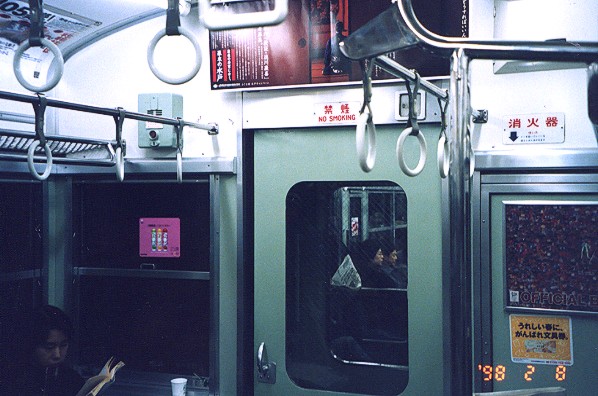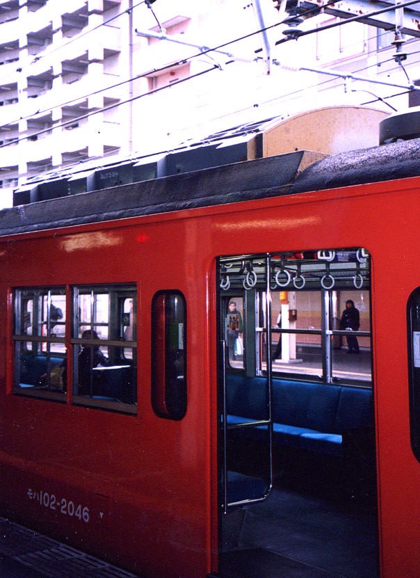 武蔵野線に転属してきていたモハ102−2046は、外ホロつきに改造された後も、ごらんのようになぜか片側の窓が埋められていない変形車でした。貫通ドアの戸袋のみが埋められています。このような改造は見たことがありません。相棒のモハ103−789も同じでした(パンタ上昇用の引きヒモが関連する?)。このグループは、赤羽線の10輌化の時新製された、「最終量産車」に属する車です。なにか関係があるのでしょうか。1998年2月8日。