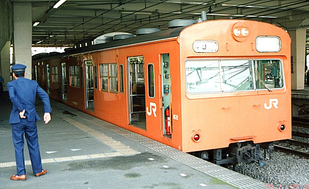 新小平駅の水害で、府中本町−西国分寺間折り返しに使用されるクハ103−620他。本来こちら側はクモハ103か、クハ103奇数車が先頭になるはずですが、豊田電車区への出入庫が、南武線経由となった関係で逆向き使用となっていました。また行先表示幕に「西国分寺」がないので、白表示のまま使用しています。運転士さんも少々手持ちぶさたの様子。シートのモケットが201系初期のようなもので、特別保全車のようですね。府中本町駅にて。1991年秋。