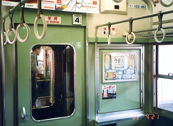 貫通ドア窓が表裏逆に付いているモハ103−462号車内。原形の103系の姿を近年まで残していた貴重な車輌でした。