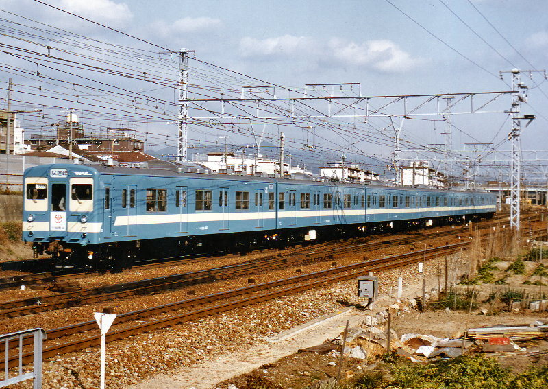 春日道駅を行く103系1500番台試運転。川崎重工の公式試運転で、ヘッドマークが付いています。この時代の塗装は青22号。帯はステッカーでクリーム色10号です。2枚ともFコレクションより、1982年。