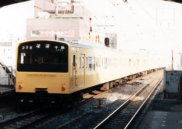 中央線に続いて、総武線各駅停車にも201系は投入されました。中古の101系ばかりに「あえいで?」いた、中野電車区にもようやく直接新車投入が行われています。画像は、この時期まだ2本のみしか走っていなかった黄色の201系で、クハ200−35他10連。中野電車区第2編成です。秋葉原駅にて、1982年11月13日撮影。