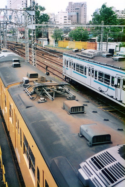 モハ201−903号の屋根上。パンタが残っている側です。パンタの形式はPS21。左奥はヒューズ箱です。ベンチレーターの右側に点線上にある出っ張りは、第2パンタへの電線管支えの跡です。離線対策のために、2つのパンタは並列につないであったようです。右側には、懐かしの301系の姿も見えますね。1996年5月5日、三鷹電車区跨線橋上から。