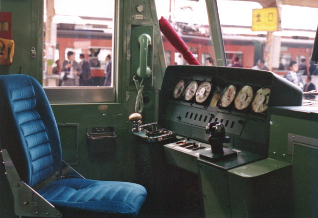 クハ185形の運転台。運転士用の座席も、通勤形などとは異なる、段の付いたモケットになっています。また背刷りも高めです。熱海駅にて、1982年頃?、「Fコレクション」より。