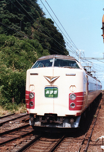 183系1000番台は、上越線特急「とき」号の、雪害による故障対策に新製が開始されていたもので、183系0番台の改良車です。これを10連に組み、この時の編成が、その後の185系「踊り子」にも引き継がれていますが、付属編成というものは無く、ここでも修善寺行きの設定は行われていません。画像は、新製投入当初の183系1000番台による「あまぎ」。川奈−富戸間にて、1976年初春。Fコレクションより。