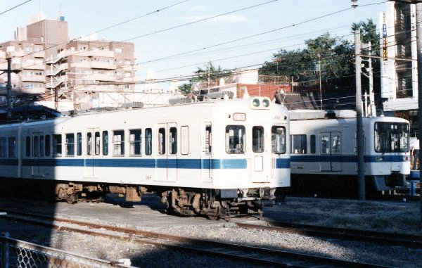 経堂駅の西側・山側にあった留置線で休む2400系と、本線4番線で待避する8000系。8000系での2400系置き換えは少しずつ進行しはじめていた時期と思います。クハ2480号他。2400系は、試験的につけた以外、スカートは設けられませんでしたが、前面下に黒く塗装された鉄板を取り付けていました。踏切事故から配管などを守るためだったのでしょうか。1985年夏。