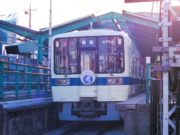 運転開始当初は、このようにヘッドマーク無しで運行されました。側面ドア上に「蘭・世界大博覧会」の文字が、これもステッカーで入れられています。シンボルマークも、「蘭」の文字の前に見えます。側面には2−3ドア部付近に、下から緑、帯色のローヤルブルーを活用して、その上に青緑、青、明るい赤、ピンクの斜め帯が入れられています。したがって帯の太さは、全てローヤルブルーに合わせ、30センチと考えられます。要検出場に合わせたのか、台車がきれいになっている8054編成による、急行新宿行き。玉川学園前−鶴川間にて撮影。1987年3月頃。