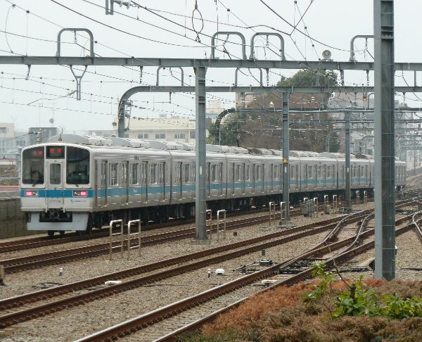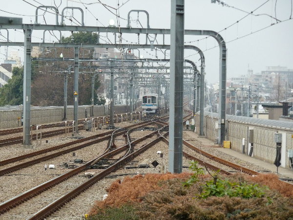下り急行線上に停車する電車(2000系)。ここで車掌さんと運転士さんが前と後ろで入れ替わり、いわゆる「エンド交換」をします。経堂駅は、このような「非常運転」を考慮した線路と信号の配置になっているようです。この画像で右へ別れていくのは、4番ホームへの線路、左下へ伸びる手前の線路は3番ホームへ、その左は順に、上り通過線、下り急行線、下り緩行線です。