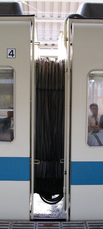 サハ9550番台(左)と、デハ9500番台(右)の、連結面ステップ位置の画像です。デハ9100番台とデハ9200番台の位置関係と同じになっているのがわかります。ステップの形状は、普通のコの字形です。2005年7月28日、経堂駅にて、デハ9504−サハ9554号で撮影。
