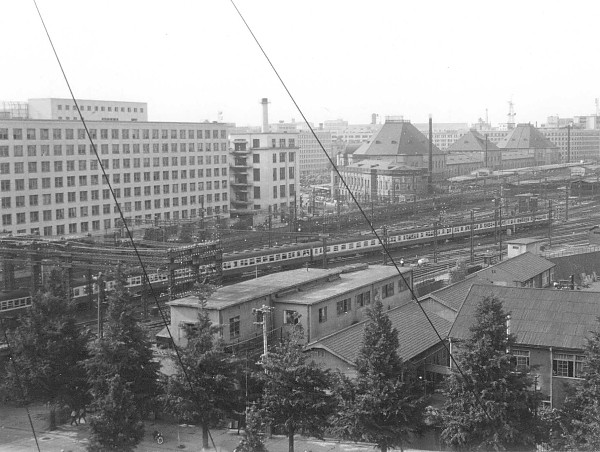 東京駅を遠望するカットです。中央到着せんとしているのは、横須賀線の電車。終着駅東京に進入するところです。右側先頭から、クハ76形、モハ70形、モハ70形、サロ75形、サハ48形(窓のようすからサハ48030〜033のどれか)、クモハ53形+クハ76形…と続きます。6連2本をつないで、12輌としていたようです。遠くの右側には東京駅の「赤煉瓦駅舎」が見えます。またその手前には山手線と思われる、茶色の72系らしき姿も見えますね。現在中央線のホーム高架化や、ビルの変化などで、この景色は一変しています。横須賀線に至っては、地下に入ってしまい、ここを走ってすらいません。1960年頃?。