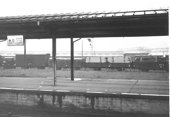 函館駅ホーム。今と比べものにならないくらい、粗末な上屋ですね。「連絡船のりば」の看板が、郷愁を誘います。奥に留置されている「黒い貨車」たちも、既に過去のものになっています。左からタキ、ワム90000、トム50000?、トラ、トラ…と続くようです。