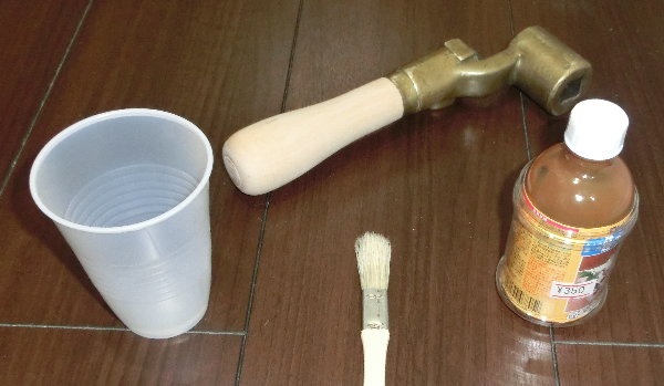 柄には通常ニスが塗られていますので、本品も同様にニスを塗ります。そのための準備をします。市販の水性ニスを使いますが、右からニス、中央奥がハンドル、手前がハケ、左側は塗装時にニスを入れるプラスチックコップです。