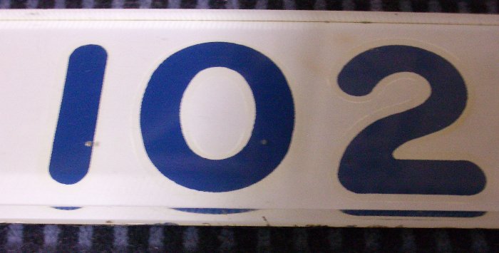 クハ183−1500番台の、盗難補充用と思われる「一部シール」の車号板です。この車号板は、もちろん実際に使われていたものですが、「クハ183−」と、「1502」の部分で、字体と色が異なることがわかります。もう少しアップで見てみます。