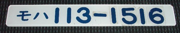 さらに仰天の仕様が発見されました。これは形式のみ裏から印刷(と思われる)としたアクリル板に、「−」と、「1516」という車号を、表から透明シール貼りとした世にも稀なる車号板です。これも「モハ113」とのみ印刷した従来仕様のアクリル板を作成しておき、盗難などがあれば、その都度所定のシールから番号を選んで貼り付け、補充品としたと考えられます。全く「泥棒対応仕様」とでも言いましょうか。大井工場か幕張電車区で作成したものと考えられますが、このように「デカールタイプ」に似た仕様のものは、113系以外では今のところ見つかっていません。